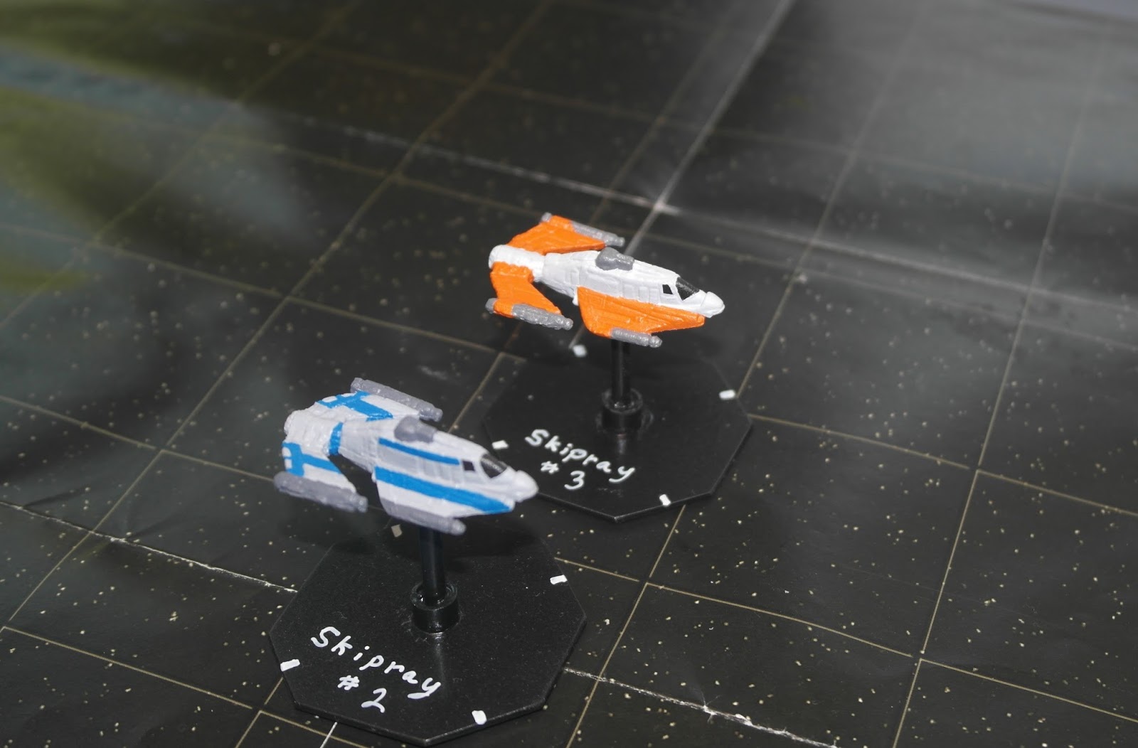 Here we can see two Skipray Blastboats facing off against a Tartan Patrol Cruiser and a Experimental TIE Fighter.The Skiprays are MicroMachines repaints based on images you can find with a Google Search.